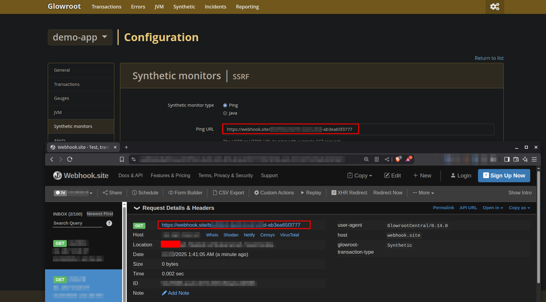 If you try to choose Ping Synthetic monitor type you can get an Server-Side Request Forgery (SSRF) , The runPing function blindly accepts any user-supplied URL and makes a direct HTTP request from the server,