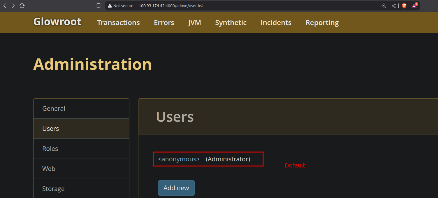 At first glance, you will notice that the default behavior of Glowroot is to create an anonymous account without a username or password. This anonymous user has full administrative rights, yet there is no alert prompting you to change or delete the account.